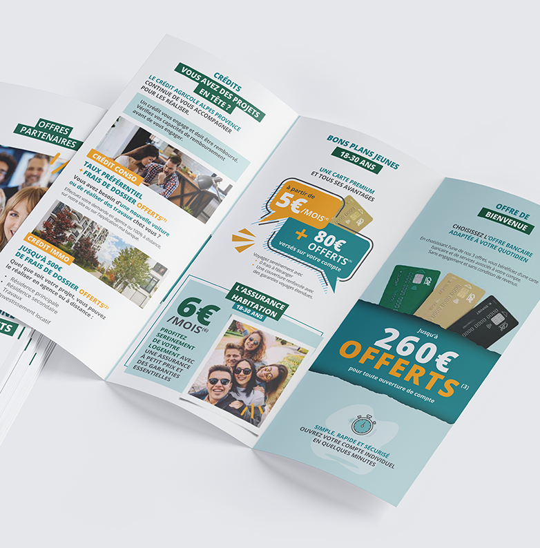 Le Crédit Agricole souhaitait une mise en page respectant strictement sa charte graphique pour une brochure de six pages. L’enjeu était d’illustrer le contenu de manière cohérente avec le sujet traité.